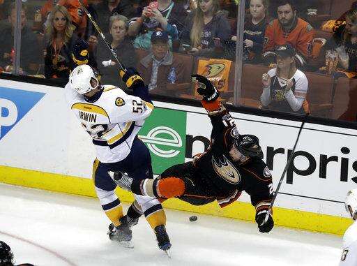 Nashville Predators' Matt Irwin (52) collides with Anaheim Ducks' Chris Wagner (21) as they battle for the puck during the second period of Game 2 of the Western Conference final in the NHL hockey Stanley Cup playoffs, Sunday, May 14, 2017, in Anaheim, Calif. (AP Photo/Chris Carlson) The Associated Press