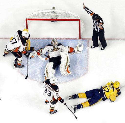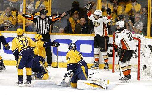Referee Brad Meier waves off an apparent goal by the Anaheim Ducks after the net was dislodged during the third period in Game 3 of the Western Conference final in the NHL hockey Stanley Cup playoffs Tuesday, May 16, 2017, in Nashville, Tenn. Arguing the call for Anaheim are Jakob Silfverberg (33), of Sweden, and Brandon Montour. At center is Predators goalie Pekka Rinne (35), of Finland. The Predators won 2-1 and lead the series 2-1. (AP Photo/Mark Humphrey)