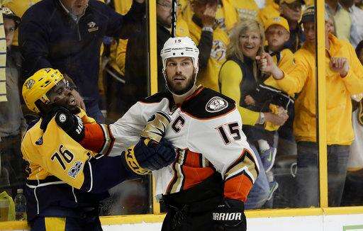 Nashville Predators defenseman P.K. Subban (76) and Anaheim Ducks center Ryan Getzlaf (15) scuffle after the conclusion of Game 3 of the Western Conference final in the NHL hockey Stanley Cup playoffs Tuesday, May 16, 2017, in Nashville, Tenn. The Predators won 2-1. (AP Photo/Mark Humphrey)