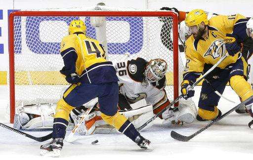 Anaheim Ducks goalie John Gibson (36) and Nashville Predators left wing Viktor Arvidsson (38), of Sweden, fall to the ice as a shot by Nashville Predators left wing Filip Forsberg, of Sweden, not shown, gets past for a goal during the third period in Game 3 of the Western Conference final in the NHL hockey Stanley Cup playoffs Tuesday, May 16, 2017, in Nashville, Tenn. The Predators won 2-1 and lead the series 2-1. Also defending for the Ducks are Sami Vatanen (45), of Finland, and Cam Fowler (4). (AP Photo/Mark Humphrey)