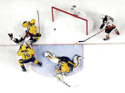 The Predators held the Ducks without a shot throughout the second period until 8:12 left when Brandon Montour put a backhand on Rinne, a puck that went across the goal line.