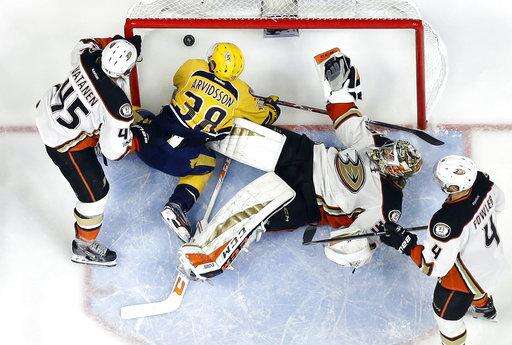 Chris Wagner went to the box for high-sticking Nashville defenseman Ryan Ellis with 3:55 left in the Ducks' offensive zone.