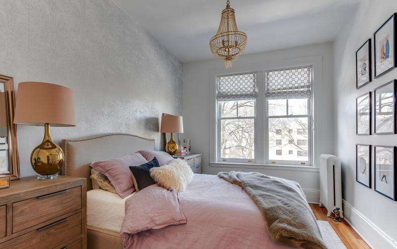Bargeron had an upholstered bed. The designers framed the wall behind it with a metallic silver lace wallpaper from Hygge & West. It sets off the lilac linen sheets from Anthropologie, the faux fur throw and 12 framed fashion prints.