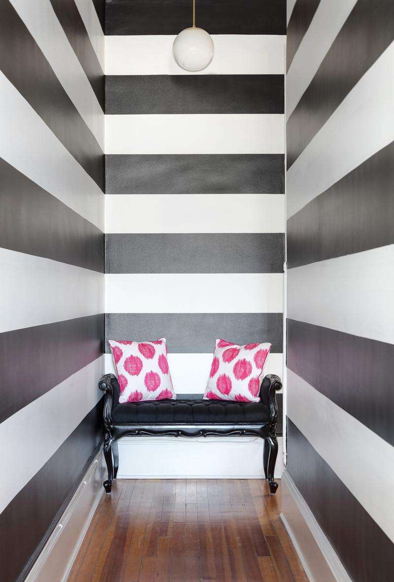 The long hallway was given 10-inch horizontal black and white stripes. "It added personality," Kushlan says, and because the wall stretches almost the full length of the unit into the living room, it also helps visually distract from the television.
