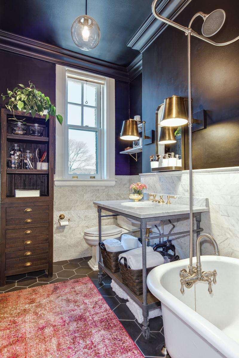 The bathroom was full of century-old details, but the tile was cracking and there was no storage. Although the designers urged her to go with an all-glass walk-in shower, Bargeron said she wanted to keep the claw-foot tub. So they added updated but classic materials such as marble subway tiles and 8-inch, hexagonal floor tiles in dark gray. A thick crown molding dressed it up, as did the Jet Black paint by Benjamin Moore and the Restoration Hardware washstand in antiqued wood, metal and marble.