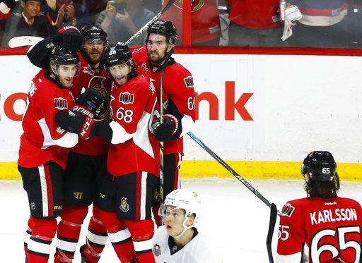 Ottawa Senators left wing Mike Hoffman (68) celebrates his goal against the Pittsburgh Penguins with Erik Karlsson (65) during the third period of Game six of the Eastern Conference final in the NHL Stanley Cup hockey playoffs in Ottawa, Ontario, Tuesday, May 23, 2017. (Sean Kilpatrick The Associated Press