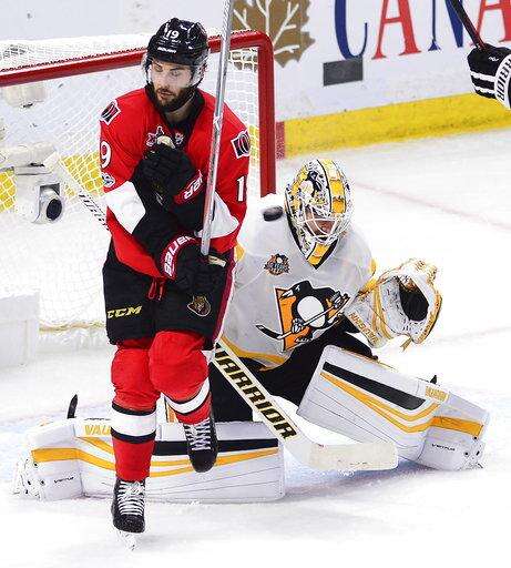 Ottawa Senators centre Derick Brassard (19) braces himself as a shot is fired toward Pittsburgh Penguins goalie Matt Murray (30) during the second period of game six of the Eastern Conference final in the NHL Stanley Cup hockey playoffs in Ottawa on Tuesday, May 23, 2017. (Sean Kilpatrick/The Canadian Press via AP) The Associated Press