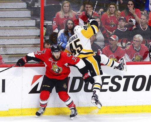 Ottawa Senators defenseman Fredrik Claesson (33) collides with Pittsburgh Penguins right wing Josh Archibald (45) during the third period of game six of the Eastern Conference final in the NHL Stanley Cup hockey playoffs in Ottawa on Tuesday, May 23, 2017. (Sean Kilpatrick/The Canadian Press via AP) The Associated Press