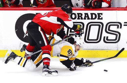 Pittsburgh Penguins centre Sidney Crosby (87) battles with Ottawa Senators defenseman Marc Methot (3) during the second period of game six of the Eastern Conference final in the NHL Stanley Cup hockey playoffs in Ottawa on Tuesday, May 23, 2017. (Sean Kilpatrick/The Canadian Press via AP) The Associated Press
