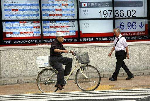 A man walks past and another rides a bicycle in front of an electronic stock board showing Japan's Nikkei 225 index at a securities firm in Tokyo Thursday, May 25, 2017. Shares in Asia are higher after an overnight advance on Wall Street spurred by the latest meeting minutes from the Federal Reserve. (AP Photo/Eugene Hoshiko) The Associated Press