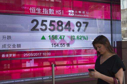 A woman walks past a screen showing the Hang Seng Index at a bank in Hong Kong, Thursday, May 25, 2017. Shares in Asia are higher after an overnight advance on Wall Street spurred by the latest meeting minutes from the Federal Reserve. (AP Photo/Kin Cheung) The Associated Press
