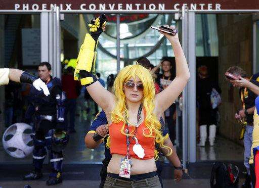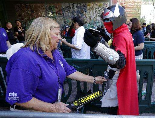 Massive crowds of attendees wearing superhero, notorious villain and anime costumes waited up to hours in long zigzagging lines outside the Phoenix Convention Center, waiting to approach the new security screenings on the second day of the city's four-day Comicon event.