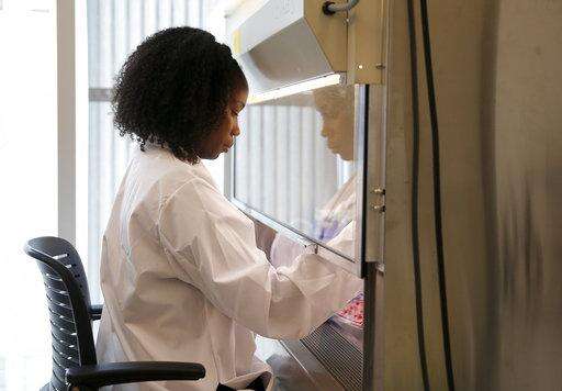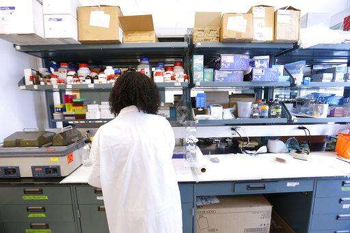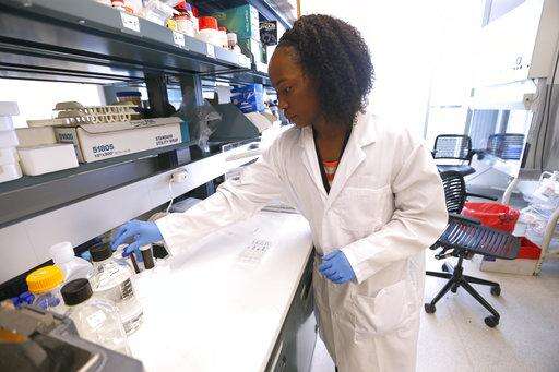 In this Tuesday, May 16, 2017 photo, Dr. Trivia Frazier, a graduate of Dillard University, works in her lab in New Orleans. Frazier returns to her alma mater frequently to inspire the next generation. Dillard University in New Orleans graduates more physics majors - and, notably, more female physics majors - than far bigger schools with more resources. (AP Photo/Gerald Herbert)