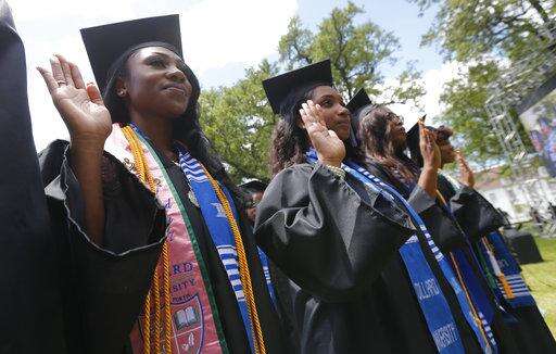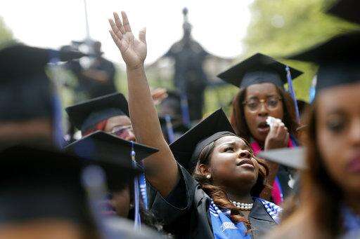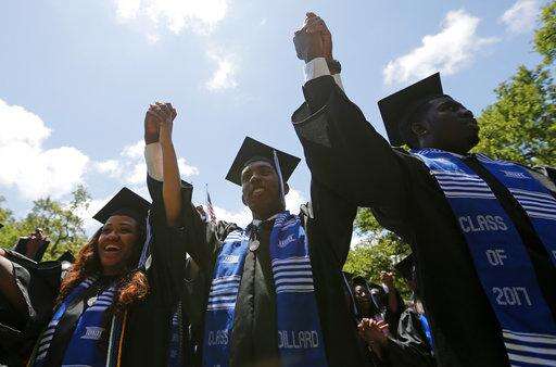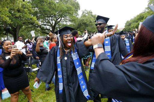In this Saturday, May 13, 2017 photo, graduates react during a graduation ceremony at Dillard University in New Orleans. Dillard University graduates more physics majors - and, notably, more female physics majors - than far bigger schools with more resources. (AP Photo/Gerald Herbert)