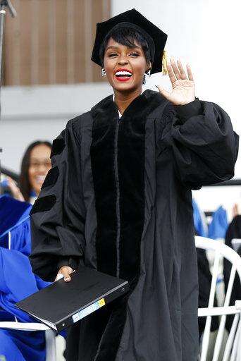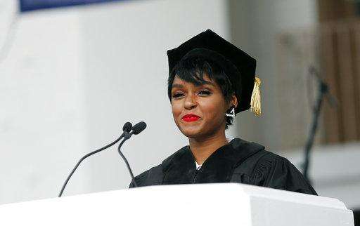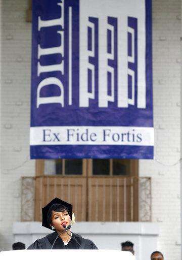 In this Saturday, May 13, 2017 photo, actress and singer Janelle Monae speaks during a graduation ceremony at Dillard University in New Orleans. With an enrollment of 1,200, Dillard ranks second in the country in black physics undergrads. The point was punctuated at Dillardâs recent commencement exercises, with a keynote address from Monae, one of the stars of âHidden Figures.â (AP Photo/Gerald Herbert)
