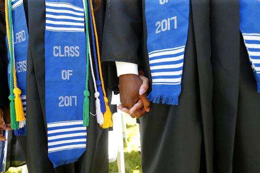 In this Saturday, May 13, 2017 photo, graduates react as they arrive before a commencement ceremony at Dillard University in New Orleans. Dillard University graduates more physics majors - and, notably, more female physics majors - than far bigger schools with more resources. (AP Photo/Gerald Herbert)