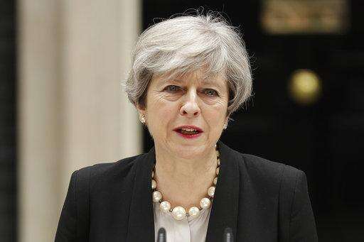 FILE - In this May 23, 2017 file photo British Prime Minister Theresa May addresses the media outside 10 Downing Street. Four leaders are making their G7 premier in the Sicilian town of Taormina, southern Italy, on May 26 and 27, 2017, U.S. President Donald Trump, France's Emmanuel Macron, Britain's Theresa May and the Italian host, Paolo Gentiloni. (AP Photo/Matt Dunham, files) The Associated Press