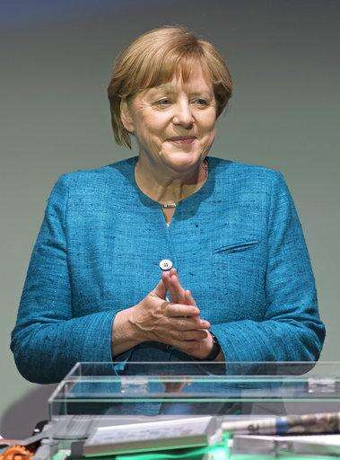 FILE - In this May 22, 2017 file photo German Chancellor Angela Merkel smiles behind a battery case during the groundbreaking ceremony for a new battery factory for German ACCUMOTIVE owned subsidiary of the Daimler AG in Kamenz, eastern Germany. Four leaders are making their G7 premier in the Sicilian town of Taormina, southern Italy, on May 26 and 27, 2017, U.S. President Donald Trump, France's Emmanuel Macron, Britain's Theresa May and the Italian host, Paolo Gentiloni. (AP Photo/Jens Meyer, file) The Associated Press