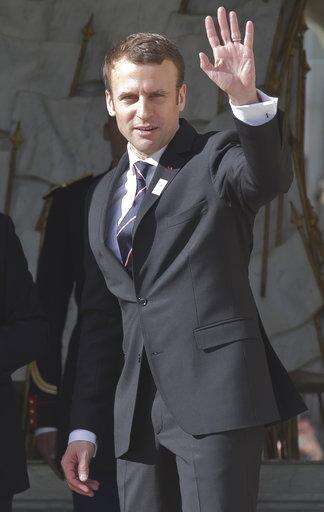 FILE - In this May 16, 2017 file photo newly elected French President Emmanuel Macron waves to the media after a meeting with the International Olympic Committee at the Elysee palace in Paris. Four leaders are making their G7 premier, U.S. President Donald Trump, France's Emmanuel Macron, Britain's Theresa May and the Italian host, Paolo Gentiloni. (AP Photo/Michel Euler, files) The Associated Press