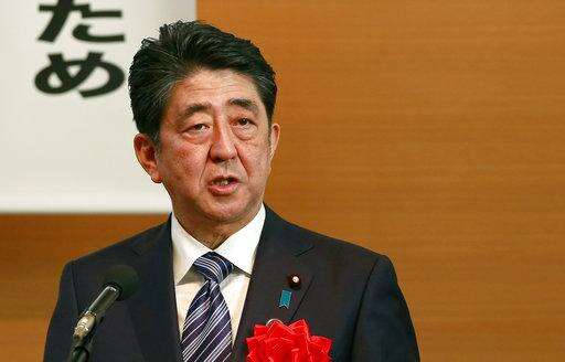 FILE - In this May 1, 2017 file photo, Japanese Prime Minister Shinzo Abe makes a speech during the annual rally on revising Japan's constitution organized by ruling party lawmakers in Tokyo, Monday, May 1, 2017. Four leaders are making their G7 premier in the Sicilian town of Taormina, southern Italy, on May 26 and 27, 2017, U.S. President Donald Trump, France's Emmanuel Macron, Britain's Theresa May and the Italian host, Paolo Gentiloni. (AP Photo/Shizuo Kambayashi, file) The Associated Press
