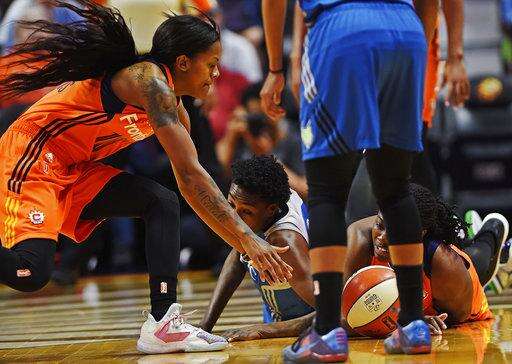 Connecticut Sun's Courtney Williams, left, and Shekinna Stricklen, right, and Minnesota's Natasha Howard dive after the ball in the first half of a WNBA basketball game Friday, May 26, 2017, in Uncasville, Conn. (Sean D. Elliot/The Day via AP) The Associated Press