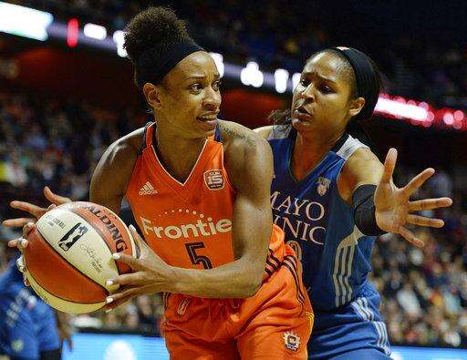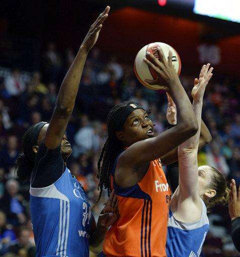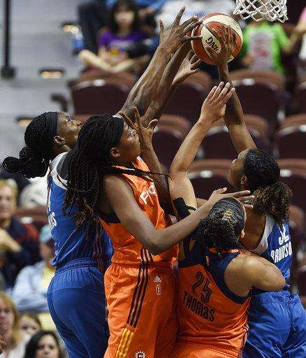 Minnesota Lynx's Sylvia Fowles, left, and Rebekah Brunson, right, battle Connecticut Sun's Jonquel Jones, center left, and Alyssa Thomas (25) for a rebound in the first half of a WNBA basketball game Friday, May 26, 2017, in Uncasville, Conn. (Sean D. Elliot/The Day via AP) The Associated Press