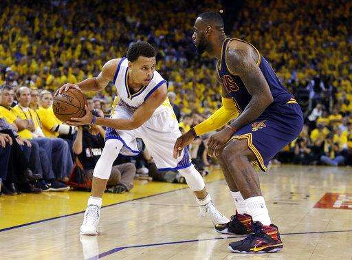 FILE - In this June 14, 2015, file photo, Golden State Warriors guard Stephen Curry, left, is guarded by Cleveland Cavaliers forward LeBron James during the second half of Game 5 of basketball's NBA Finals in Oakland, Calif. While there have been 14 rematches in NBA Finals history, this year's meeting between LeBron James' Cleveland Cavaliers and Stephen Curry's Golden State Warriors will be the first trilogy in league history. (AP Photo/Ben Margot, File) The Associated Press