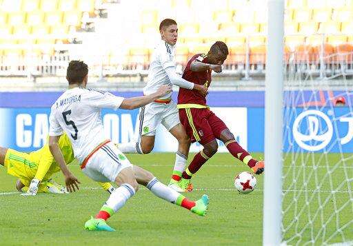 Venezuela's Sergio Cordova, right, scores a goal against Mexico during their Group B soccer match in the FIFA U-20 World Cup Korea 2017 at Suwon World Cup Stadium in Suwon, South Korea, Friday, May 26, 2017. (Kim In-chul/Yonhap via AP) The Associated Press