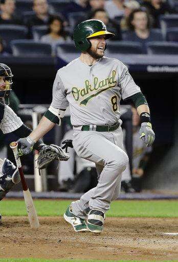 Oakland Athletics' Jed Lowrie (8) follows through on an RBI-single during the eighth inning of a baseball game against the New York Yankees, Friday, May 26, 2017, in New York. (AP Photo/Frank Franklin II) The Associated Press