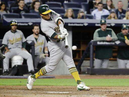 Oakland Athletics' Khris Davis hits an RBI-single during the eighth inning of a baseball game against the New York Yankees, Friday, May 26, 2017, in New York. (AP Photo/Frank Franklin II) The Associated Press