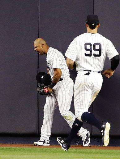 New York Yankees left fielder Aaron Hicks, left, celebrates with Aaron Judge, right, after catching a ball hit by Oakland Athletics' Stephen Vogt for an out during the seventh inning of a baseball game Friday, May 26, 2017, in New York. (AP Photo/Frank Franklin II) The Associated Press