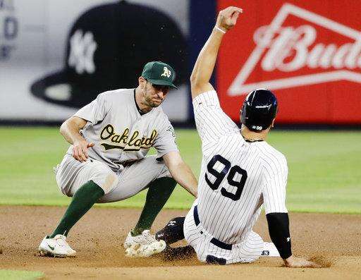 Oakland Athletics shortstop Adam Rosales (16) tags out New York Yankees' Aaron Judge (99) who was attempting to steal second base during the fourth inning of a baseball game Friday, May 26, 2017, in New York. (AP Photo/Frank Franklin II) The Associated Press