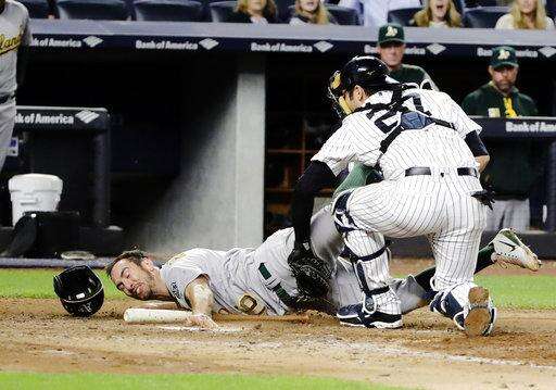 Oakland Athletics' Rajai Davis (11) passes New York Yankees catcher Austin Romine to score on a single by Jed Lowrie during the eighth inning of a baseball game Friday, May 26, 2017, in New York. (AP Photo/Frank Franklin II) The Associated Press