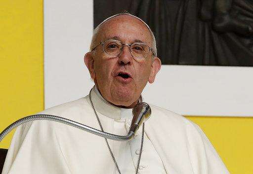 Pope Francis is greeted by faithful as he meets with bishops, priests and nuns at the Cathedral of San Lorenzo during his one day visit to Genoa, northern Italy, Saturday, May 27, 2017. (L'Osservatore Romano/Pool Photo via AP)