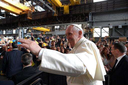 Pope Francis arrives at the ILVA steel-making company in Genoa, Italy, Saturday, May 27, 2017. Pope Francis has begun a one-day visit to the northern Italian port city of Genoa to meet with workers, poor and homeless people, refugees and prisoners. His opened his visit at ILVA, a troubled steel-making company, where workers in hard hats awaited him. The visit puts a focus on the plight of workers whose lives have been made precarious by years of economic crisis. (AP Photo/Antonio Calanni)