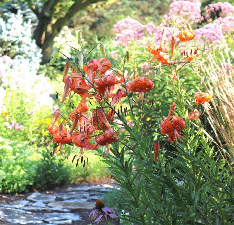 Tiger lilies boast their large flowers with freckled petals in August. They multiply, forming large clumps over time.