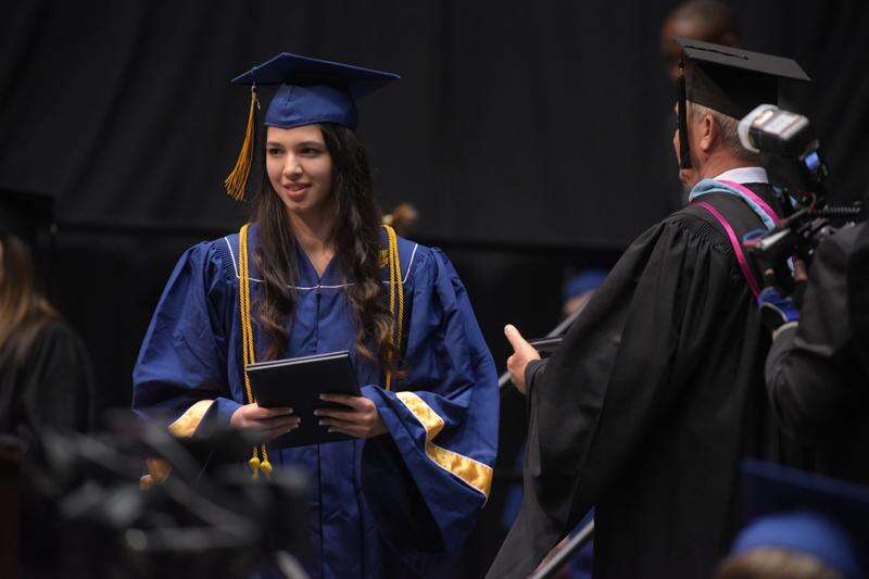Mackenzie Sammeth gives the Senior Reflection Address during Neuqua Valley High School graduation on Sunday, May 28, at Northern Illinois University in DeKalb.
