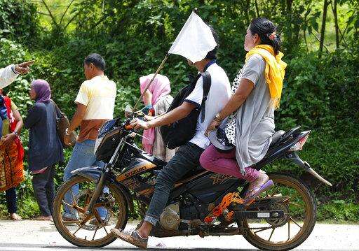 With a white flag to indicate they are non-combatants, displaced residents ride a motorbike to flee to safer areas as government troops battle with Muslim militants Monday, May 29, 2017 in Marawi, southern Philippines. Philippine forces say they now control most of the southern city where militants linked to the Islamic State group launched a bloody siege nearly a week ago. Presidential Spokesman Ernesto Abella said Monday that only small areas of Marawi are under militants' control. (AP Photo/Bullit Marquez)