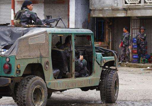 Police patrol the streets of Marawi city as government troops battle with Muslim militants who continue to hold their ground in some areas of the city for almost a week Monday, May 29, 2017 in southern Philippines. Philippine forces control most of the southern city where militants linked to the Islamic State group launched a bloody siege nearly a week ago, authorities said Monday, as the army launched airstrikes and went house-to-house to crush areas of resistance. (AP Photo/Bullit Marquez)
