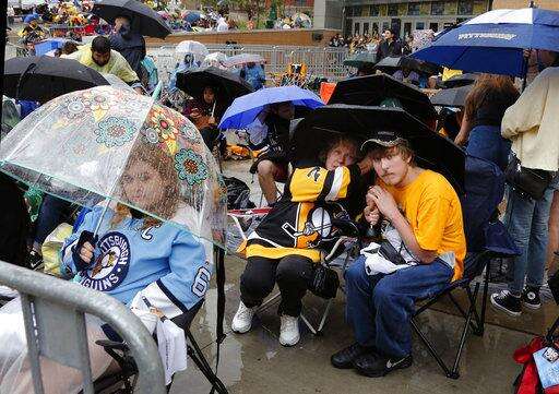 From left, Brooke Staudt, of Munhall, Pa., and Maureen Sams and Pierce Sams, of Carnego, Pa., wait in the rain outside PPG Paints Arena before Game 2 of the NHL hockey Stanley Cup Final between the Pittsburgh Penguins and the Nashville Predators, Wednesday, May 31, 2017, in Pittsburgh. (AP Photo/Gene J. Puskar) The Associated Press