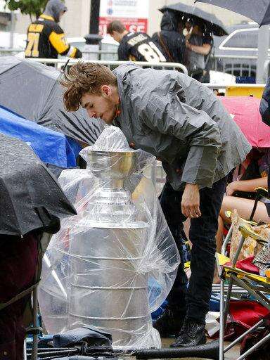 Zach Smith, of Crafton, Pa., covers his Stanley Cup replica as he waits in the rain outside PPG Paints Arena before Game 2 of the NHL hockey Stanley Cup Final between the Pittsburgh Penguins and the Nashville Predators, Wednesday, May 31, 2017, in Pittsburgh. (AP Photo/Gene J. Puskar) The Associated Press