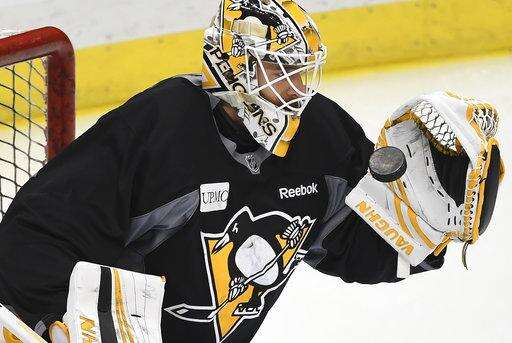 Pittsburgh Penguins Matt Murray catches the puck during hockey practice, Wednesday, May 31, 2017 at PPG Paints Arena in Pittsburgh. (Peter Diana/Pittsburgh Post-Gazette via AP) The Associated Press