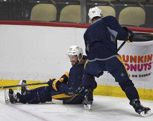 Nashville Predators' Craig Smith (15) jokes with teammate Brad Hunt as he pushes him into the corner during NHL hockey practice before Game 2 of the Stanley Cup Finals against the Pittsburgh Penguins at PPG Paints Arena in Pittsburgh, Wednesday, May 31, 2017. (Peter Diana/Pittsburgh Post-Gazette via AP) The Associated Press