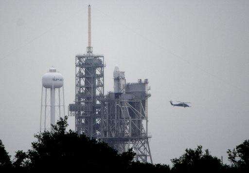 A helicopter flies past the Falcon 9 SpaceX rocket with the first recycled cargo ship that would carry supplies to the International Space Station as it sits on pad 39A moments after the launch was scrubbed because of bad weather at the Kennedy Space Center in Cape Canaveral, Fla., Thursday, June 1, 2017. SpaceX will make another attempt to launch on Saturday.(AP Photo/Phil Sandlin)