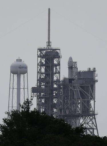 A Falcon 9 SpaceX rocket with the first recycled cargo ship carrying supplies to the International Space Station sits on pad 39A moments before the launch was scrubbed because of bad weather at the Kennedy Space Center in Cape Canaveral, Fla., Thursday, June 1, 2017. SpaceX will make another attempt to launch on Saturday. (AP Photo/John Raoux)