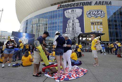 Nashville Predators fans set up to watch outside Bridgestone Arena before Game 3 of the NHL hockey Stanley Cup Finals between the Nashville Predators and the Pittsburgh Penguins Saturday, June 3, 2017, in Nashville, Tenn. (AP Photo/Mark Humphrey) The Associated Press