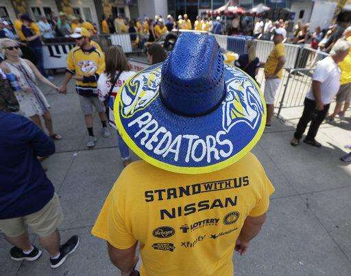 A Nashville Predators fan walks outside the arena before Game 3 of the NHL hockey Stanley Cup Finals between the Nashville Predators and the Pittsburgh Penguins Saturday, June 3, 2017, in Nashville, Tenn. (AP Photo/Mark Humphrey) The Associated Press