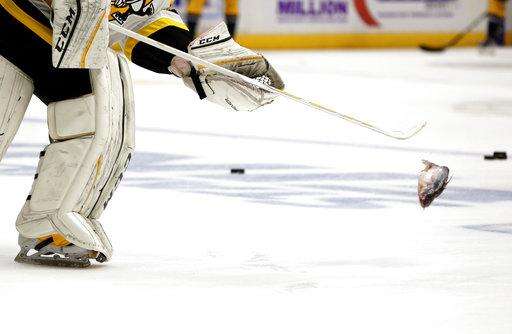 Pittsburgh Penguins goalie Marc-Andre Fleury flips a catfish off the ice before the start of Game 3 of the NHL hockey Stanley Cup Finals Saturday, June 3, 2017, in Nashville, Tenn. (AP Photo/Mark Humphrey) The Associated Press