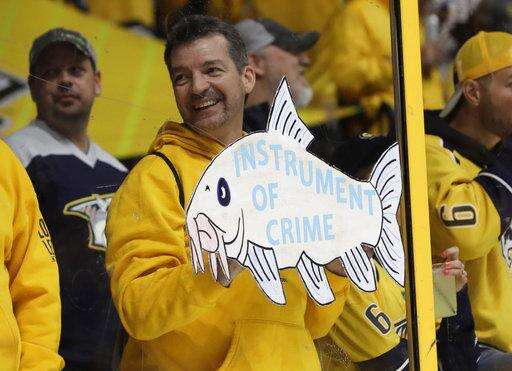 A Nashville Predators fan holds up a catfish sign before Game 3 of the NHL hockey Stanley Cup Finals Saturday, June 3, 2017, in Nashville, Tenn. (AP Photo/Mark Humphrey) The Associated Press