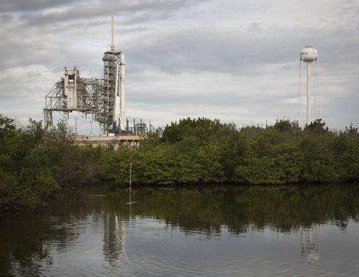 In this photo provided by NASA, the SpaceX Falcon 9 rocket, with the Dragon spacecraft onboard, is seen at Launch Complex 39A at NASA's Kennedy Space Center in Cape Canaveral, Fla., Saturday, June 3, 2017. SpaceX is trying again to launch its first recycled supply ship to the International Space Station. Forecasters at Florida's Kennedy Space Center are cautiously optimistic storms won't halt Saturday afternoon's countdown like they did Thursday. (Bill Ingalls/NASA via AP) The Associated Press